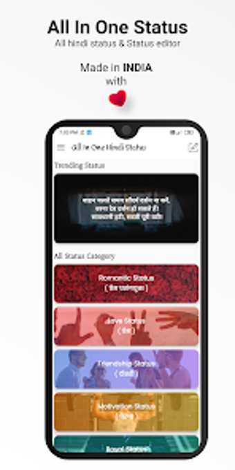 All In One Hindi Status är en gratis app för Android som erbjuder ett brett utbud av Hindi-statusar för användning på plattformar som WhatsApp och Facebook. Appen innehåller kategorier som attityd, vänskap, kärlek och mer, vilket gör det enkelt för användare att hitta och dela statusar med vänner och familj. Den innehåller också funktioner för att skapa anpassad status med olika stilalternativ, inklusive bakgrundsbilder och textformat.